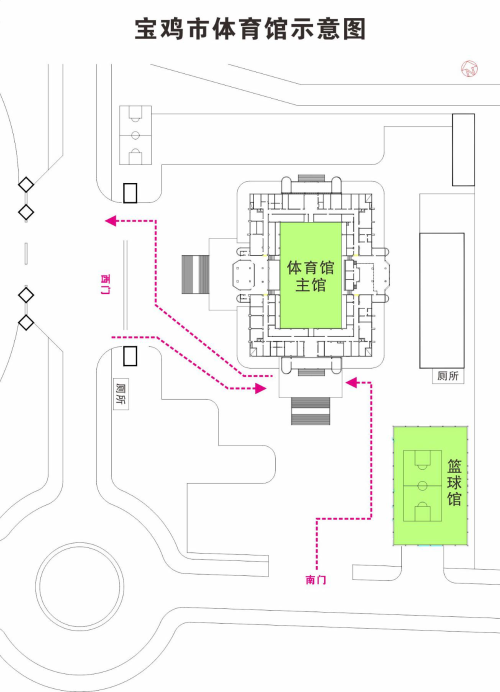 主館、附館(籃球訓(xùn)練館)、室外籃球場及市國民體質(zhì)監(jiān)測中心。
